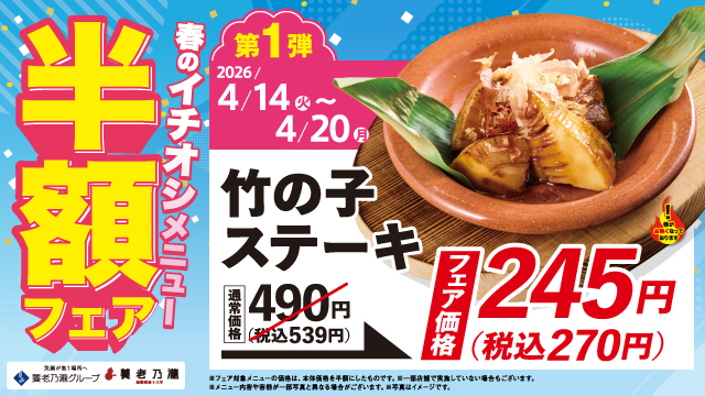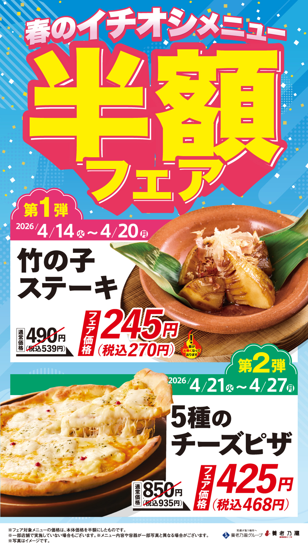 2026年4月14日(火)に実施されます養老乃瀧のメニュー改定に伴い、『春のイチオシメニュー半額フェア』を開催いたします。本フェアでは、対象の新メニューについて、期間中、通常価格の半額で提供いたします。